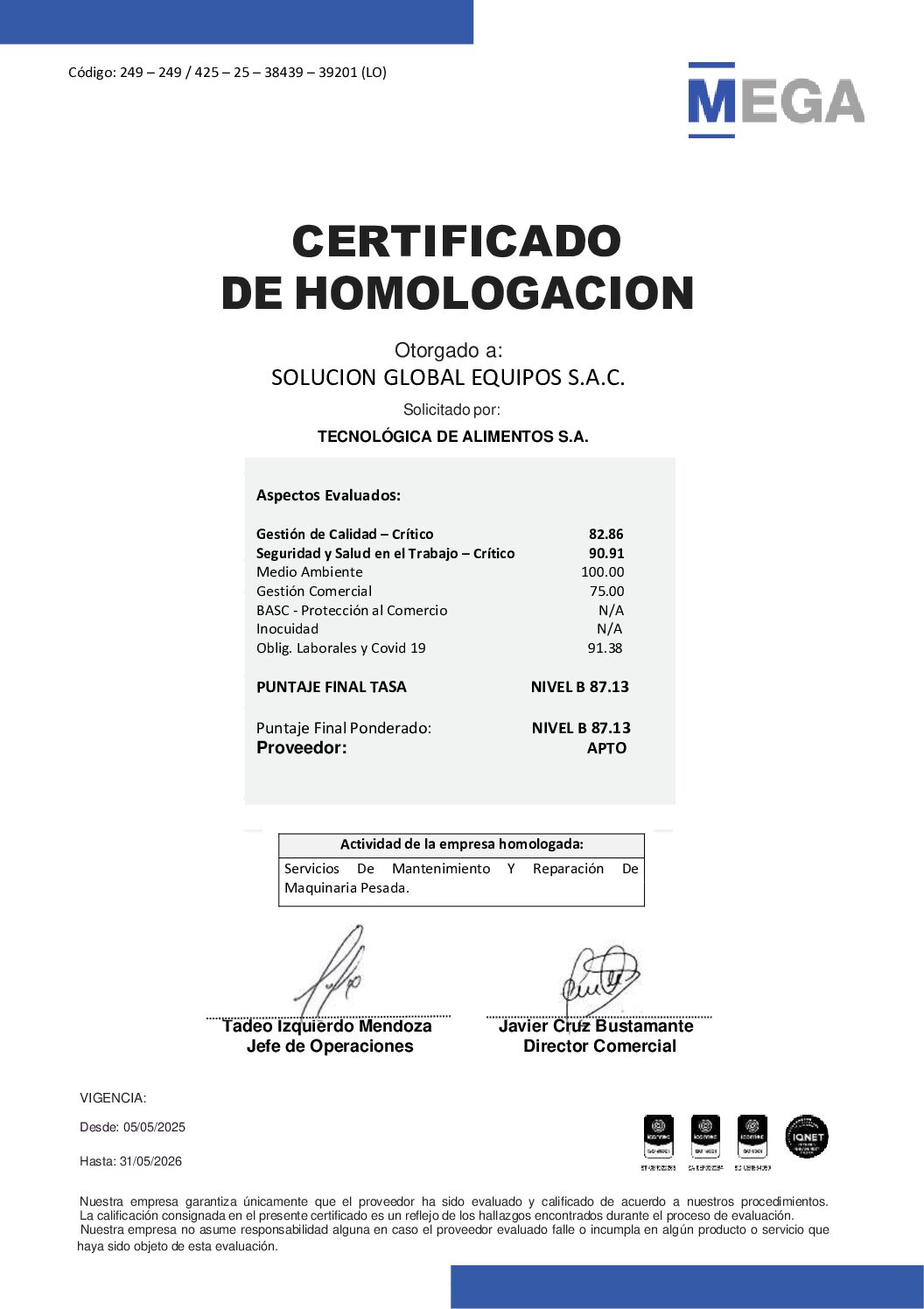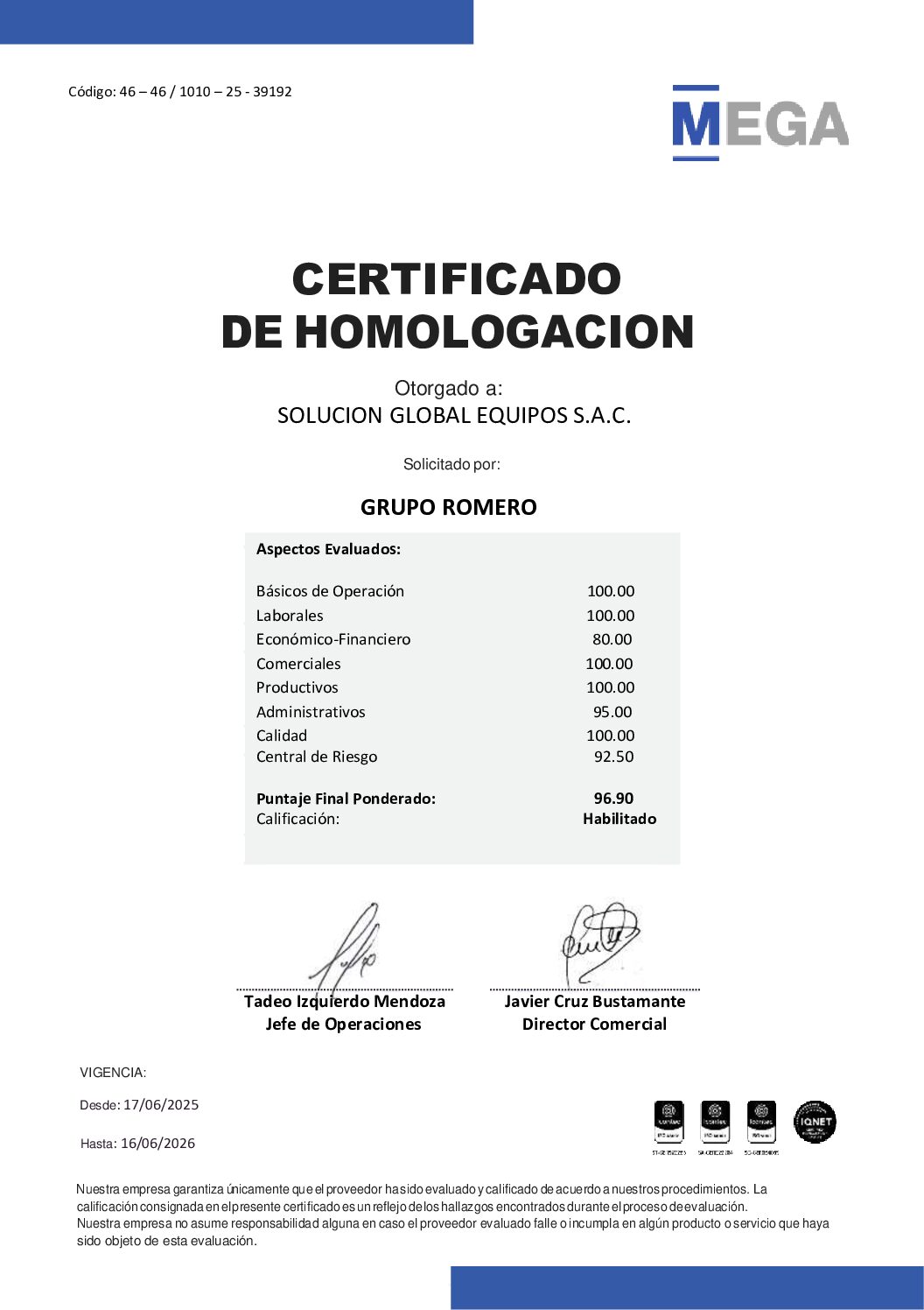Por este motivo, al contar con este Certificado de Homologación, estamos calificados como una empresa que brinda servicios de calidad y que ofrece productos de garantía, por lo que nos califica como una empresa confiable, para realizar labores en los diversos sectores económicos a nivel nacional.